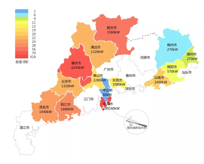 2018年,在港珠澳大桥充电桩项目中,北京恒郁科技有限公司在港珠澳大桥珠海端口岸人工岛搭建的充电管理平台及电能量采集终端,为大桥的绿色运营和电力保障提供技术支持。除此之外,仅广东省内,北京恒郁科技有限公司充电桩涵盖肇庆、珠海等14个城市,具体分布情况如下图所示。