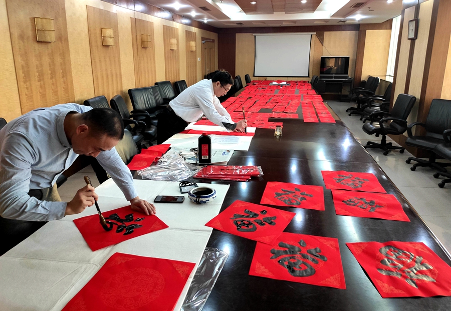 烟台市国企服务一队精心撰写春联和福字并“送福”到单身宿舍;股份公司现场特地安排了抽奖环节,准备了一大波时尚奖品增加热闹气氛。